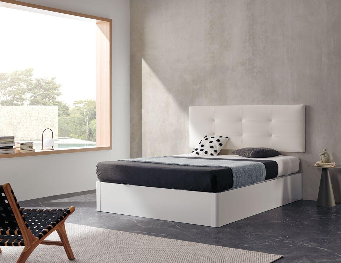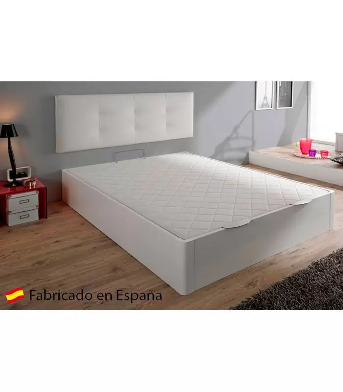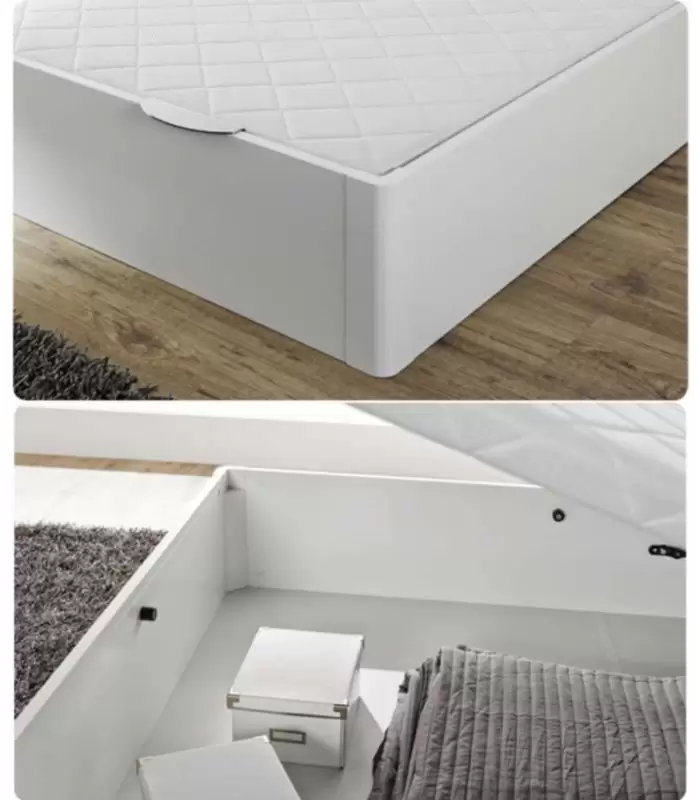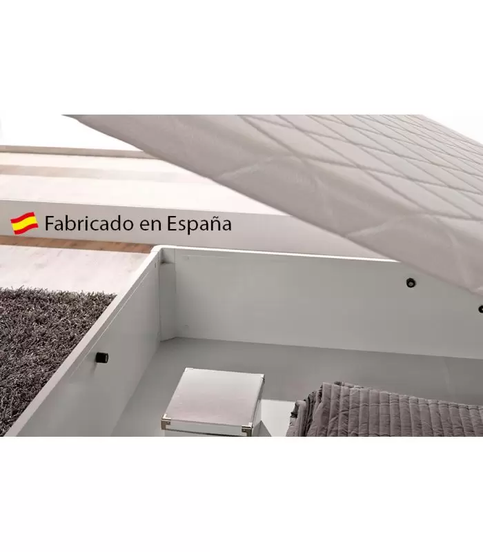 Canapé abatible de madera con gran capacidad interior y apertura cómoda mediante pistones hidráulicos. Ideal para maximizar el almacenamiento del dormitorio.